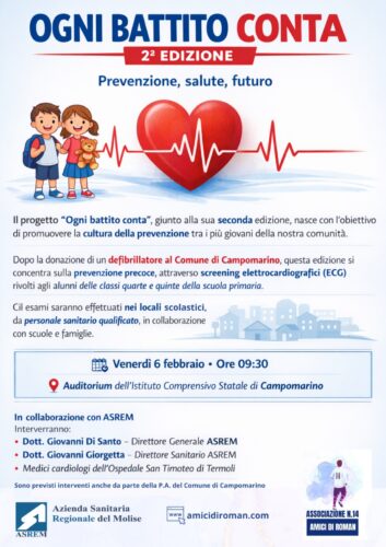 L’iniziativa punta alla prevenzione precoce come strumento fondamentale di tutela della salute. In questo mese molti alunni di quarta e quinta primaria effettueranno, gratuitamente, uno screening elettrocardiografico a cura di personale sanitario qualificato.
